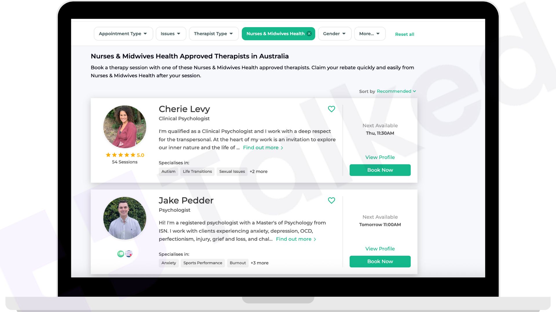 Or, you can use platforms like Talked that make it easy to find AHPRA-registered psychologists who are also recognised by Nurses & Midwives Health. You can browse profiles, select someone who matches your needs, and book a telehealth appointment - often within 24 hours.