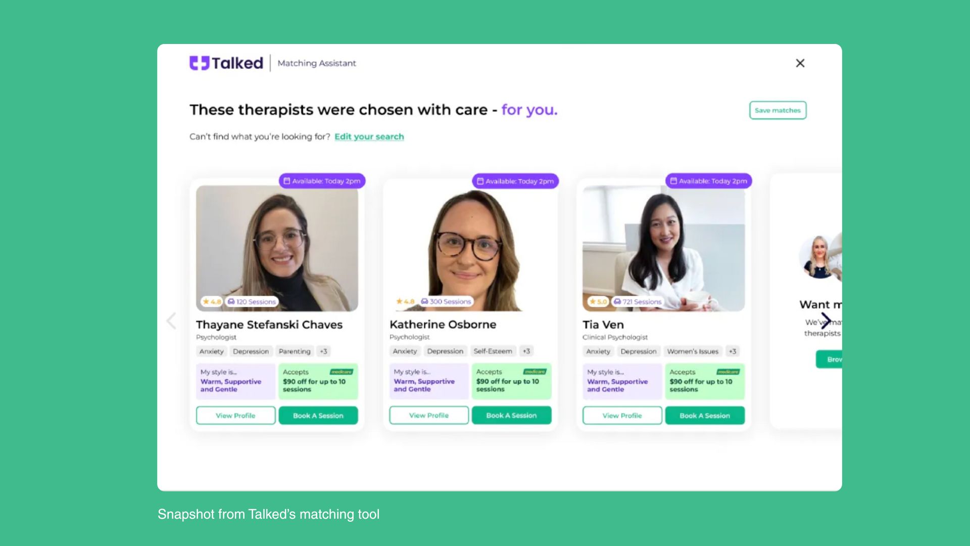 Talked knows that you don’t always get the right fit at first booking, and that’s why Talked offers free and unlimited 15-minute sessions where you can meet different therapists and assess who can help you best before booking a full session.