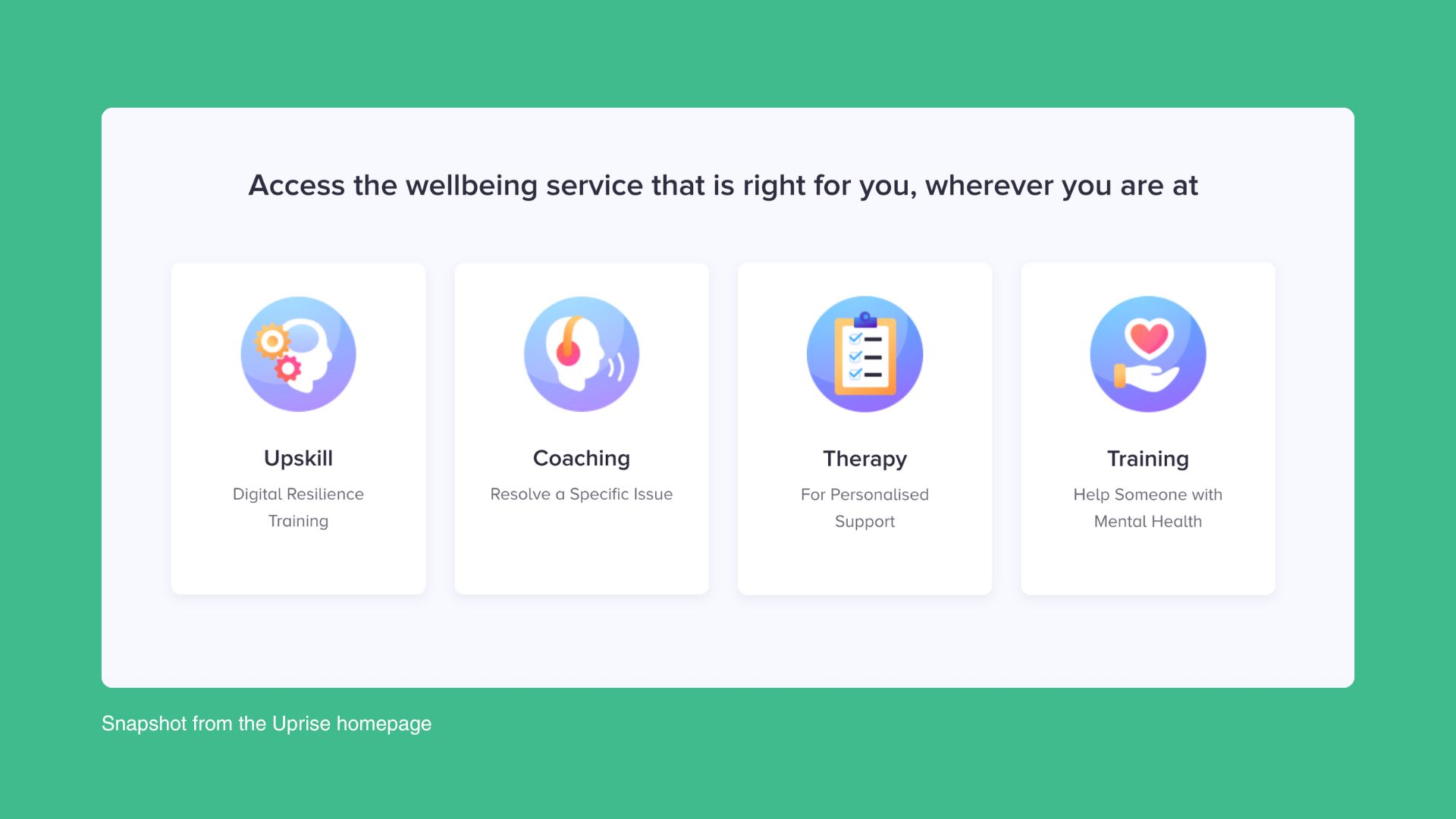 Apart from therapy and coaching, Uprise offers access to a mix of self-guided mental fitness courses, resilience training, company or team-wide awareness events, and other psychosocial services.