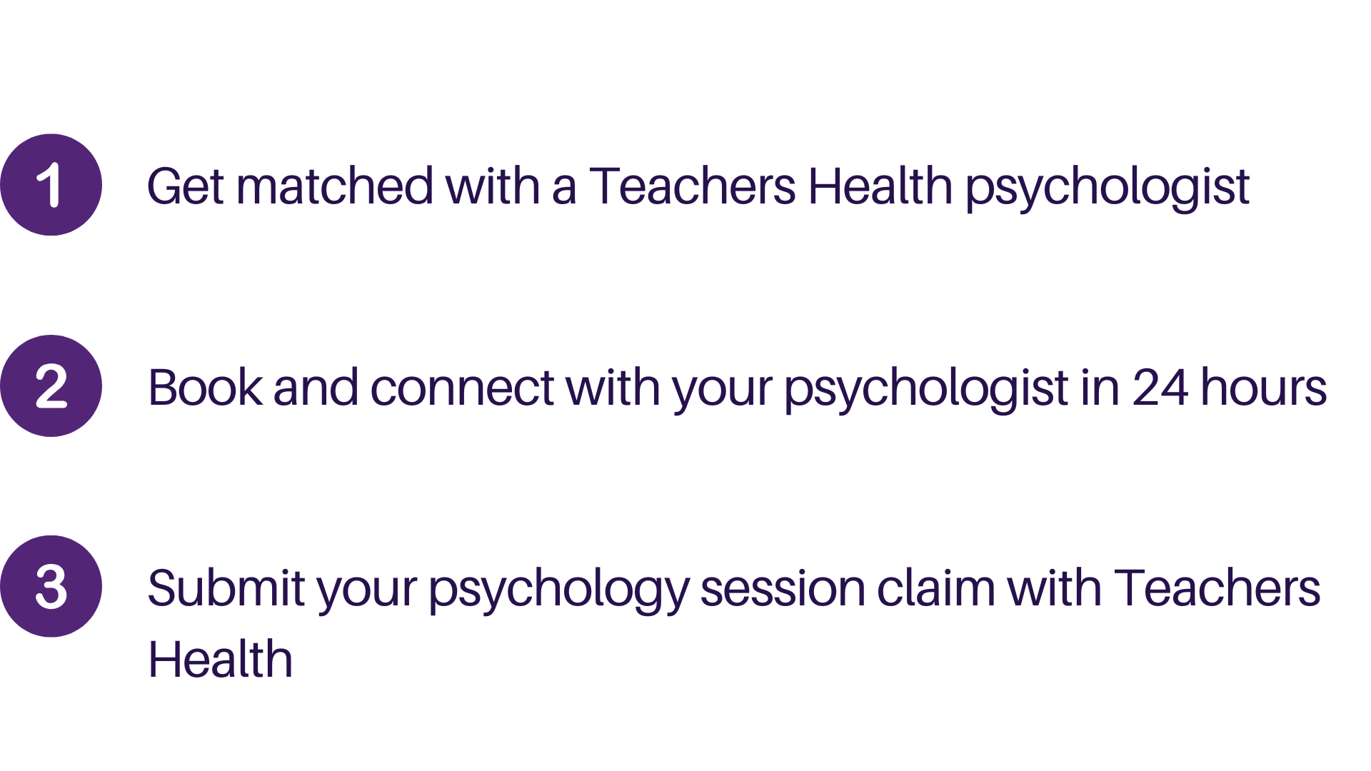 When booking your Teachers Health psychology session through Talked, payment will be required upfront. Once your session is complete, we’ll issue you an invoice that you can use to claim your rebate directly from Teachers Health.
